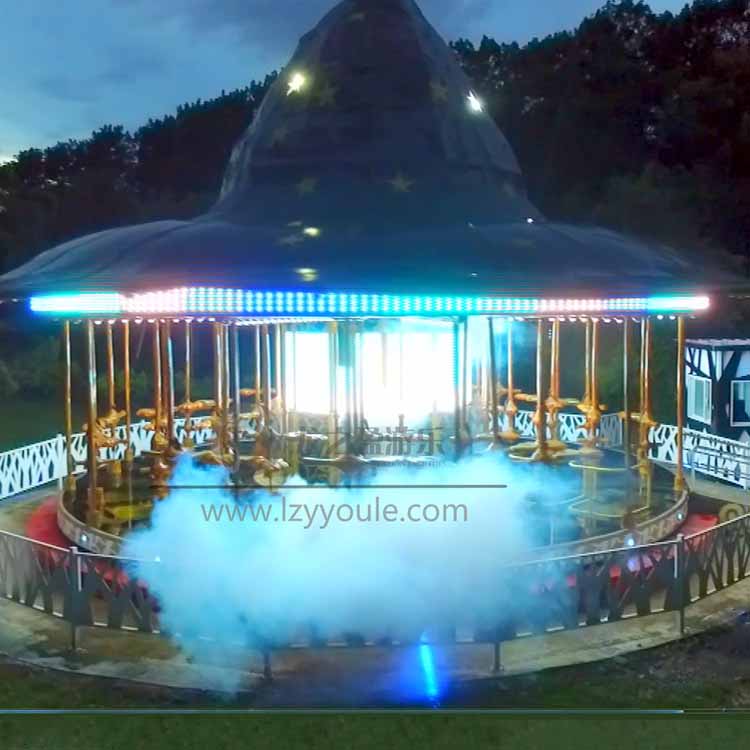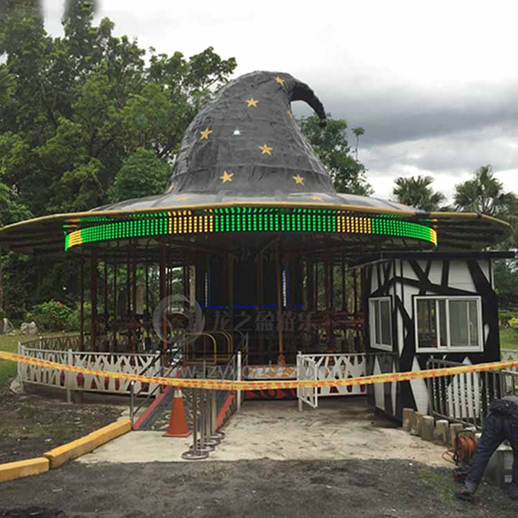 旋轉木馬是游樂場里常見的一款兒童游樂設備,伸手大人與小孩的喜愛。由于技術的發展,傳統的旋轉木馬延伸出許多造型新奇的新型轉馬,今天就為大家介紹一款由龍之盈生產,大陸與臺灣攜手設計的一款新型轉馬-飛天魔帽,采用了許多前沿的技術,加入了許多新的玩法,接下來就隨著開啟一段奇妙之旅吧。