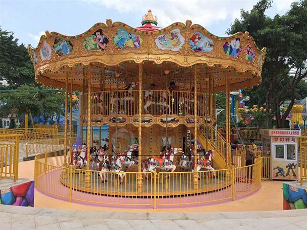 豪華轉馬作為游樂設備行業的標志,一直經久不衰,他的趣味性加上豪華轉馬外觀的多樣性使得每天乘坐轉馬的人不在少數,尤其是小孩子,非常喜歡這類的大型游樂設備,很多大人把小孩放到轉馬上就不管了,以為在上面有轉馬經營人員看著就可以了,其實不然,像一般的38座豪華轉馬來說,坐滿了就有三四十個人,一個游樂設備經營者根本就招呼不過來,更別說龍之盈推出的76座豪華轉馬了!