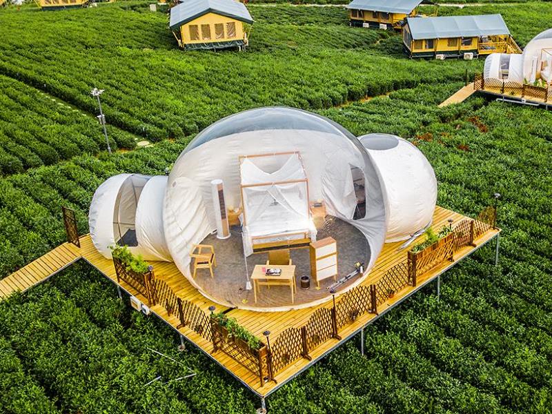星空泡泡屋概念初是由法國設計師杜馬斯設想出來的,目的就是重新定義臨時休閑住宿。它的設計理念是用低的能源和少的材料帶給的安慰,讓人與環境有和諧的互動。星空泡泡屋以透明質地為媒介,可以更清楚的觀看到周邊的環境,夜間躺在床上仰望星空,盡情的探索自然與生命的奇幻。星空宿泡泡屋分為單泡和多泡。房型的設計不僅滿足了與自然近距離接觸的體驗,在生活品質上相較于傳統野宿,也得到大大提升。作為可移動建筑物,泡泡屋可謂百變。從住宿到餐廳再到游樂園,滿足多種生活需要。